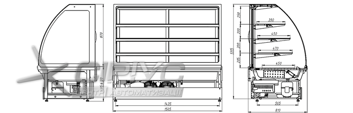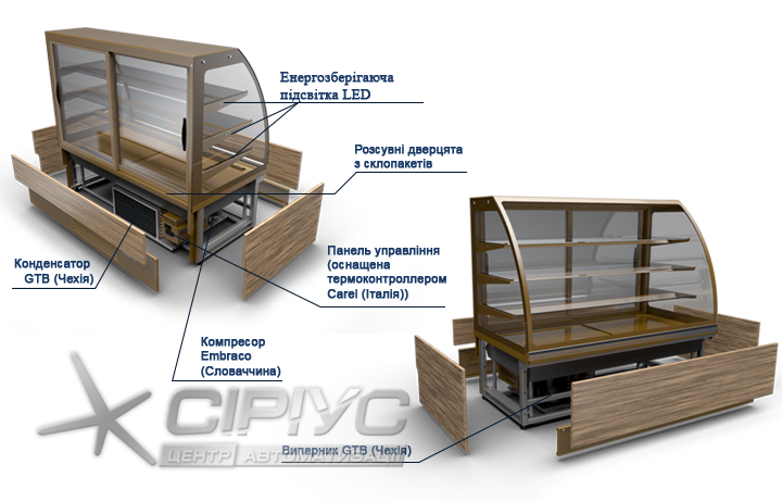 Для товару у вітрині передбачено три скляні полиці та нижній піддон. Ширина полиць складає 47, 43, 38 см. Загальна площа експозиції товарів - 1,66 м2. Температурний режим вітрини холодильної кондитерської від +6 до +12 °С. Тип охолодження в камері динамічний. Використовується автоматичне розморожування.