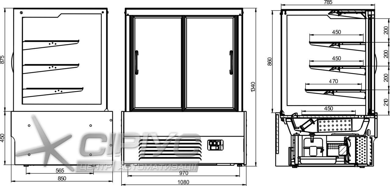 Для товару у вітрині передбачено три скляні полиці та нижній піддон. Ширина полиць складає 47, 43, 38 см. Загальна площа експозиції товарів - 1,66 м2. Температурний режим вітрини холодильної кондитерської від +6 до +12 °С. Тип охолодження в камері динамічний. Використовується автоматичне розморожування.