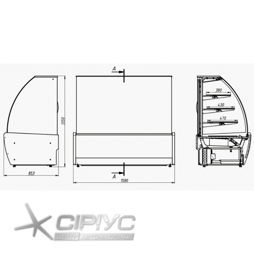 Для товару у вітрині передбачено три скляні полиці та нижній піддон. Ширина полиць складає 47, 43, 38 см. Загальна площа експозиції товарів - 2,47 м2. Температурний режим вітрини холодильної кондитерської від +6 до +12 °С. Тип охолодження в камері динамічний. Використовується автоматичне розморожування.